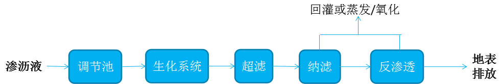 為響應(yīng)《生活垃圾填埋場(chǎng)污染控制標(biāo)準(zhǔn)》(GB 16889-2008)中垃圾滲濾液污染物排放限值的相關(guān)要求,按照《生活垃圾填埋場(chǎng)滲濾液處理工程技術(shù)規(guī)范(試行)》(HJ 564-2010)和《生活垃圾滲瀝液處理技術(shù)規(guī)范》(CJJ 150-2010),目前預(yù)處理+生物處理+膜處理的處理工藝(見圖3)是我國滲濾液處理的主流組合工藝。