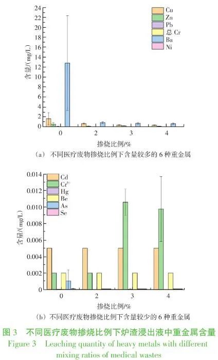 圖3(a)表示了不同比例摻雜醫(yī)療廢物爐渣含量較多的重金屬浸出情況,可見醫(yī)療廢物的摻入對Cu和Ba的浸出影響較為明顯,隨著醫(yī)療廢物摻入比例的增加,Cu的浸出量明顯降低,從1.6 mg/L降低到0.33 mg/L。Ba浸出量降低的趨勢更加明顯,從12.82 mg/L降低到0.64~0.89 mg/L,這是由于生活垃圾成分復(fù)雜,分類不夠徹底時,部分灰土、玻璃、磚瓦陶瓷、金屬類垃圾等成分會嚴(yán)重影響爐渣中的Ba元素含量,但是醫(yī)療廢物中并不存在這些組分,因此Ba的浸出濃度降低明顯。摻燒醫(yī)療廢物后爐渣中Zn的含量與原爐渣比也有所降低,但不同醫(yī)廢摻燒比例下的Zn含量變化不大,在0.1~0.2 mg/L范圍波動。Long等研究了中國城市垃圾中重金屬的分布,指出廚余、灰渣、塑料以及紙張占垃圾總量的55.1%~99.5%,并且這幾種垃圾組分中的Cu及Zn含量分別占垃圾總量的 76.3%和 82.3%。醫(yī)療廢物這些組分相對較少,所以Cu和Zn的含量略有降低。摻入醫(yī)療廢物混燒后,其他重金屬浸出濃度相對較少,并無明顯變化。爐渣中含量較多的重金屬,含量高低依次為:Ba>Zn>Cu。但是其浸出濃度遠(yuǎn)遠(yuǎn)低于GB 5085.3—2007危險廢物鑒別標(biāo)準(zhǔn) 浸出毒性鑒別的限值。