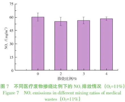圖7顯示日常運(yùn)行焚燒煙氣中NOx排放量為60.18 mg/m3,完全滿足排放標(biāo)準(zhǔn)。在摻燒醫(yī)療廢物后NOx的含量總體上有微幅降低。其中2%摻燒比例降低明顯,為55.18 mg/m3,降低了8.3%,這主要因為此時系統(tǒng)的脫硝劑用量最大,見圖6。顯著性分析顯示,醫(yī)療廢物的摻燒對NOx排放影響不大,數(shù)據(jù)無顯著性差異,這是因為NOx的濃度與脫硝藥劑消耗量及溫度有對應(yīng)關(guān)系,一方面圖2顯示摻燒后爐膛溫度有微弱下降,另一方面圖6顯示煙氣脫硝劑的消耗量有所增加,最終使得NOx排放水平基本穩(wěn)定。
