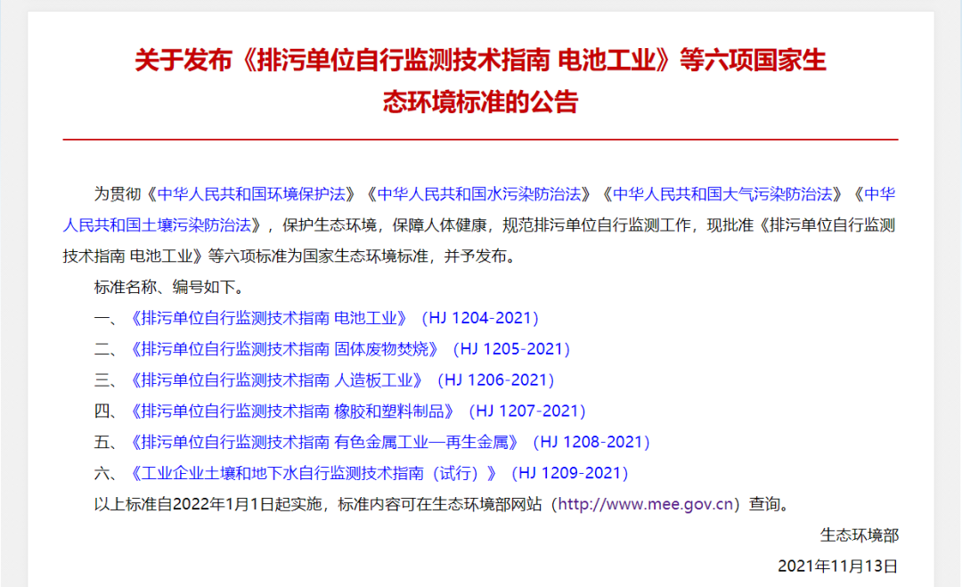 《排污單位自行監(jiān)測技術指南 電池工業(yè)》等六項國家生態(tài)環(huán)境標準