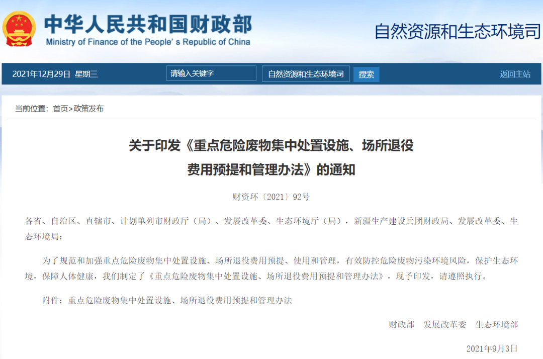 重點危險廢物集中處置設施、場所退役費用預提和管理辦法