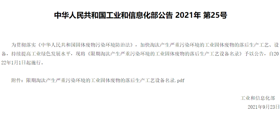 限期淘汰產(chǎn)生嚴重污染環(huán)境的工業(yè)固體廢物的落后生產(chǎn)工藝設備名錄
