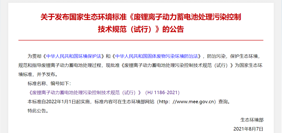 廢鋰離子動力蓄電池處理污染控制技術規(guī)范(試行)