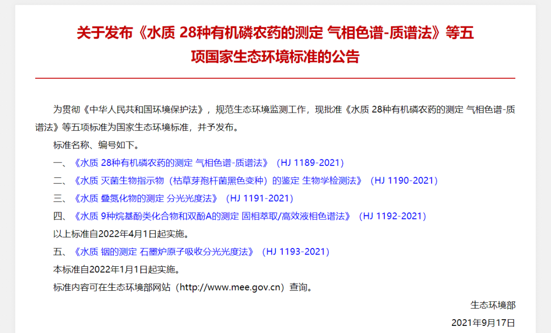 《水質 28種有機磷農(nóng)藥的測定 氣相色譜-質譜法》等五項國家生態(tài)環(huán)境標準