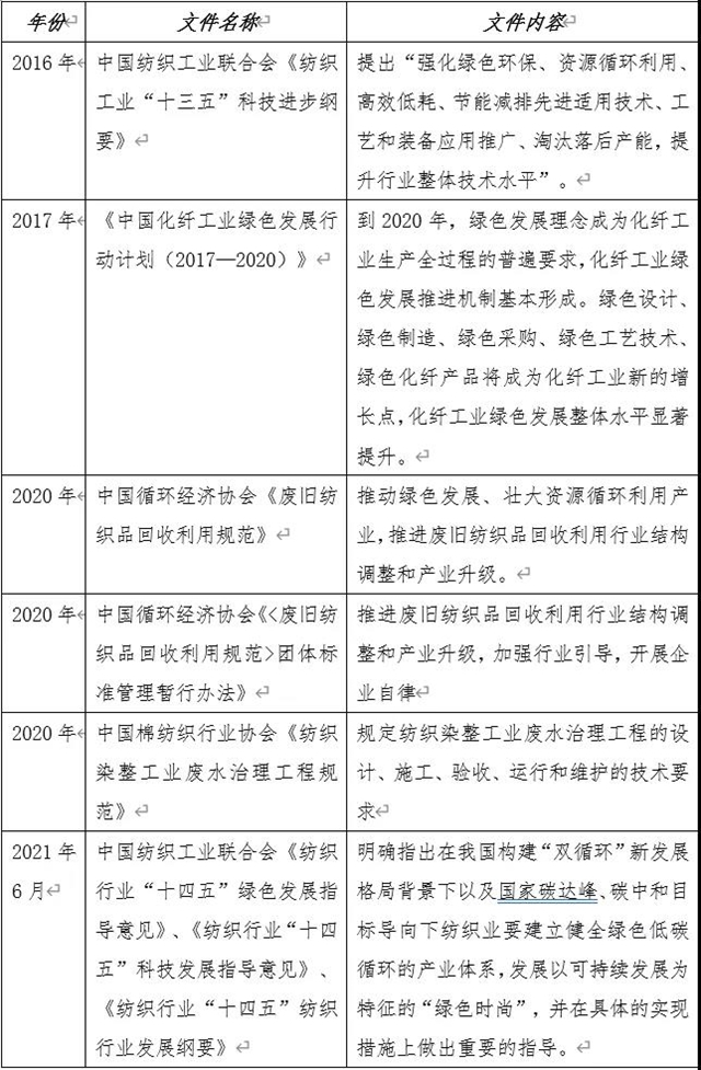標(biāo)準(zhǔn)指導(dǎo)層面,《綠色產(chǎn)業(yè)指導(dǎo)目錄(2019年版)》將廢舊紡織品無(wú)害化再生利用裝備、紡織印染等高用水行業(yè)廢水處理回用裝置以及廢舊紡織品等廢舊資源的再生利用列入節(jié)能環(huán)保產(chǎn)業(yè),將紡織行業(yè)的園區(qū)產(chǎn)業(yè)鏈接循環(huán)化改造列入清潔生產(chǎn)產(chǎn)業(yè)。將紡織面料等產(chǎn)品的低碳產(chǎn)品認(rèn)證和推廣列入綠色服務(wù)。