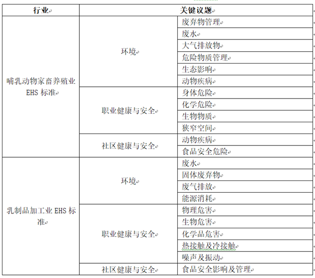 在聯(lián)合國可持續(xù)發(fā)展目標(biāo)及各個國際組織出臺的可持續(xù)議題基礎(chǔ)之上,目前國際上也形成了行業(yè)導(dǎo)向的可持續(xù)發(fā)展標(biāo)準(zhǔn)。其中,由世界銀行集團(tuán)國際金融公司制定的《環(huán)境、健康與安全指南(EHS)》中就有針對乳制品行業(yè)的養(yǎng)殖端與加工端,在充分考慮行業(yè)特色的基礎(chǔ)上分別形成了兩套指標(biāo),《哺乳動物家畜養(yǎng)殖業(yè)環(huán)境、健康與安全指南》與《乳制品加工業(yè)環(huán)境、健康與安全指南》,重點(diǎn)關(guān)注行業(yè)在環(huán)境、職業(yè)健康與安全、社區(qū)健康與安全三大領(lǐng)域下的可持續(xù)發(fā)展。對于乳制品行業(yè)的養(yǎng)殖端來說,應(yīng)重點(diǎn)關(guān)注環(huán)境層面的表現(xiàn),包括養(yǎng)殖過程中的廢棄物、廢水處理、溫室氣體排放情況、潛在生態(tài)影響、動物疾病等方面;對于加工端來說,應(yīng)重點(diǎn)關(guān)注加工制造過程中的能耗情況、廢氣排放情況、固體廢棄物處理,以及生產(chǎn)安全情況等方面。