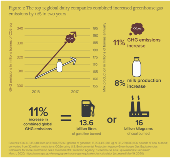 乳制品指的是使用牛乳或羊乳及其加工制品為主要原料,加入或不加入適量的維生素、礦物質(zhì)和其他輔料,使用法律法規(guī)及標(biāo)準(zhǔn)規(guī)定所要求的條件,經(jīng)加工制成的各種食品。乳制品包括液體乳(巴氏殺菌乳、滅菌乳、調(diào)制乳、發(fā)酵乳);乳粉(全脂乳粉、脫脂乳粉、部分脫脂乳粉、調(diào)制乳粉、牛初乳粉);其他乳制品(等)。國際農(nóng)業(yè)和貿(mào)易政策研究所(IATP)2020年發(fā)布的《Milking the Planet》報(bào)告指出,乳制品行業(yè)是全球溫室氣體排放量上升的主要原因之一。報(bào)告中提到2017年全球十三大乳制品公司產(chǎn)生了超過3.38億噸的溫室氣體,已經(jīng)超過了兩個全球最大的化石燃料排放企業(yè)總部位于澳大利亞的礦業(yè)、石油和天然氣巨頭(BHP)和總部位于美國的石油公司(ConocoPhillips)。盡管各國政府在2015年簽署了《巴黎協(xié)定》,致力于控制碳排放量,但2015-2017年這13家公司的總排放量仍增長了11%,增加的3230萬噸溫室氣體相當(dāng)于一年內(nèi)行駛690萬輛乘用車造成的污染。