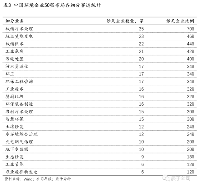 更細(xì)分去看,城鎮(zhèn)污水處理、垃圾焚燒發(fā)電、城鎮(zhèn)供水、工業(yè)危廢等是中國(guó)環(huán)境企業(yè)50強(qiáng)布局最多的細(xì)分領(lǐng)域(見表3),這些領(lǐng)域基本都是規(guī)模上千億甚至數(shù)千億的市場(chǎng),“盤子”足夠大,商業(yè)模式穩(wěn)定,是環(huán)境強(qiáng)企必爭(zhēng)之地。