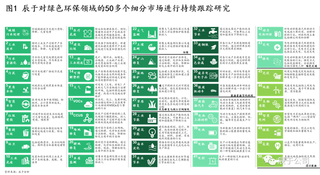 作為一家聚焦于綠色發(fā)展領(lǐng)域的專業(yè)咨詢機(jī)構(gòu),結(jié)合以往項(xiàng)目經(jīng)驗(yàn)以及業(yè)內(nèi)習(xí)慣,辰于對(duì)綠色環(huán)保行業(yè)范圍進(jìn)行了明確劃分,目前已經(jīng)持續(xù)跟蹤50多個(gè)細(xì)分領(lǐng)域(見圖1)。有意思的一點(diǎn)是,過去的環(huán)保行業(yè)范圍一般是指包含供水、各類污染物末端處置和治理以及環(huán)境監(jiān)測(cè)在內(nèi)的傳統(tǒng)環(huán)保領(lǐng)域,雙碳戰(zhàn)略提出后,當(dāng)人們談到“環(huán)保”時(shí),更多是指“綠色環(huán)保”的概念,節(jié)能、清潔能源、雙碳業(yè)務(wù)等行業(yè)也被納入。