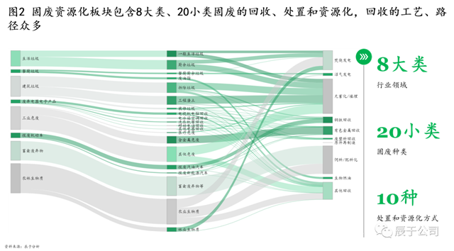 固廢資源化板塊包含8大類、20小類固廢的回收、處置和資源化,回收的工藝、路徑眾多(見圖2),除此之外還包含環(huán)衛(wèi)等服務(wù)領(lǐng)域,最大的特點(diǎn)就是規(guī)模大——當(dāng)前的總市場(chǎng)規(guī)模超過2萬(wàn)億,足夠容納20個(gè)千億級(jí)環(huán)保企業(yè),而且“十四五”期間預(yù)計(jì)還將保持8%~10%的年復(fù)合增長(zhǎng)率。