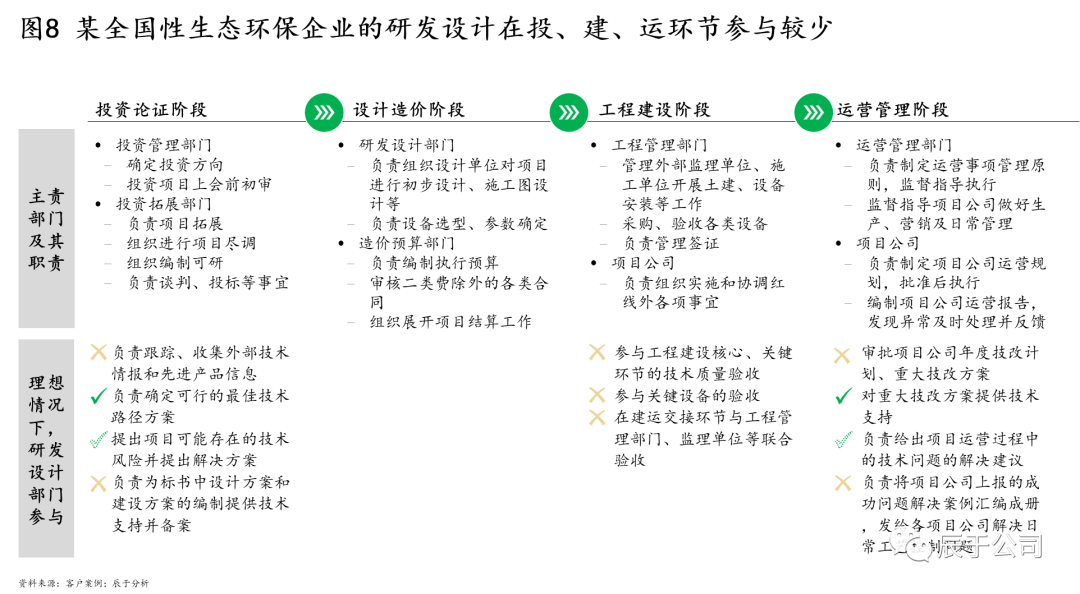 國內(nèi)生態(tài)環(huán)保企業(yè)“重投建、輕技運”的問題由來已久,由于沒有將研發(fā)設(shè)計放在一個正確的位置與高度,導(dǎo)致總部-事業(yè)部-項目公司的研發(fā)設(shè)計定位不清,該總部牽頭做的沒人做,該項目公司負責(zé)的,由于目的明確、相對簡單,各級主體“搶著做”,原本有限的技術(shù)資源散亂在內(nèi)部的各個層級和角落,沒有形成各司其職、各盡其責(zé)、上下一致的合力。