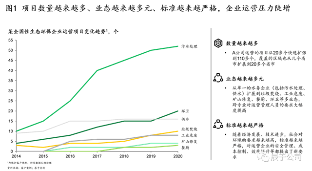 近幾年來,一批環(huán)保企業(yè)蓬勃發(fā)展,規(guī)模迅速擴(kuò)張,他們所持有的項(xiàng)目數(shù)量越來越多,業(yè)態(tài)越來越多元。以我們服務(wù)的某全國(guó)性生態(tài)環(huán)保企業(yè)為例,2014-2020年間,運(yùn)營(yíng)項(xiàng)目從20多個(gè)增加到100多個(gè),覆蓋區(qū)域從8個(gè)省市擴(kuò)張到20多個(gè),業(yè)態(tài)也從單一的污水、供水,延伸到垃圾焚燒、工業(yè)危廢、礦山修復(fù)、餐廚、環(huán)衛(wèi)等“水、固、生態(tài)修復(fù)”協(xié)同發(fā)展(見圖1)。