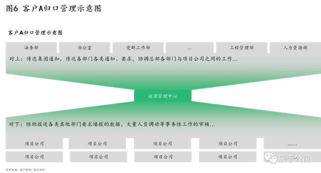 我們也看到,對(duì)項(xiàng)目公司的管理,一些企業(yè)簡(jiǎn)單的劃分為建設(shè)階段的項(xiàng)目公司由工程管理部門統(tǒng)籌管理、運(yùn)營(yíng)階段的則由運(yùn)營(yíng)管理部門統(tǒng)籌管理,對(duì)上“傳達(dá)集團(tuán)通知,傳達(dá)各部門各類通知、要求,協(xié)調(diào)總部各部門與項(xiàng)目公司之間的工作”,對(duì)下“協(xié)助報(bào)送各類其他部門要求填報(bào)的數(shù)據(jù),大量人員調(diào)動(dòng)等事務(wù)性工作的審核”等,原本簡(jiǎn)單的總部-項(xiàng)目公司兩級(jí)架構(gòu),演變成總部其他部門——總部(工程)運(yùn)營(yíng)管理部門——(工程期)運(yùn)營(yíng)期項(xiàng)目公司“漏斗型”三級(jí)架構(gòu) (見圖6)。