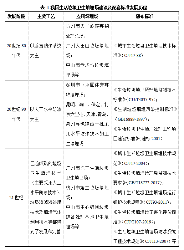 我國生活垃圾衛(wèi)生填埋技術(shù)主要經(jīng)歷了三個(gè)階段:20世紀(jì)80年代以垂直防滲為主的衛(wèi)生填埋場、20世紀(jì)90年代以水平防滲為主的衛(wèi)生填埋場、21世紀(jì)垃圾衛(wèi)生填埋技術(shù)、垃圾滲濾液處理技術(shù)及填埋氣體利用技術(shù)完善的衛(wèi)生填埋場,建設(shè)及配套標(biāo)準(zhǔn)見表1[1]。