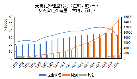 目前,生活垃圾處理方式主要分為衛(wèi)生填埋、焚燒和堆肥。我國垃圾產(chǎn)生量逐年增加(圖1),生活垃圾清運(yùn)量由2003年的14856.5萬噸增長至2020年的23511.7萬噸,生活垃圾無害化處理量由2003年的7544.7萬噸增長至2020年的23452.3萬噸,無害化處理率由50.8%增長至99.7%,其中,衛(wèi)生填埋占比由2003年的84.9%降低至2020年的33.1%。近年來,我國對環(huán)保日益重視,垃圾處理的“減量化、資源化、無害化”的水平逐漸提升,基本實(shí)現(xiàn)生活垃圾無害化處理。