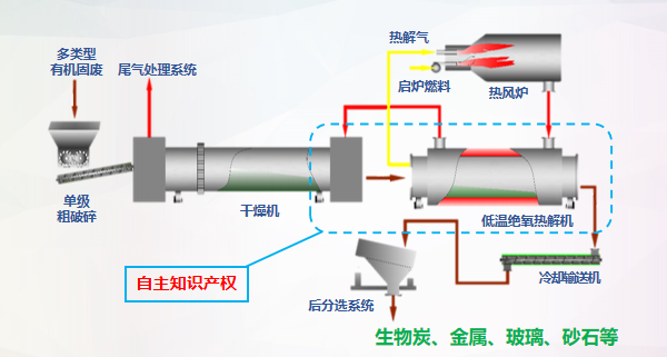 低溫絕氧熱解碳化技術(shù)是個負(fù)碳過程,也是碳中和、碳達(dá)峰的重要手段之一。其具有兩大特點:一是,技術(shù)包容性強(qiáng),污泥、餐廚垃圾等多種類有機(jī)固廢協(xié)同處理;二是,100%資源化,熱解氣回歸系統(tǒng)再利用,終產(chǎn)物只有生物炭、金屬、玻璃、砂石。