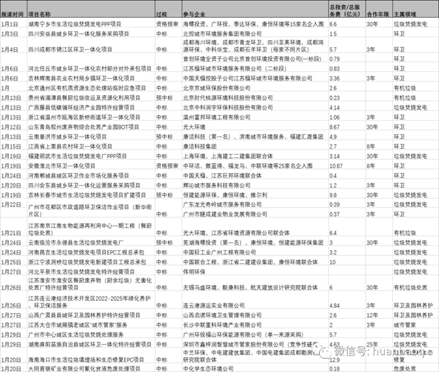 1月,固廢市場(chǎng)共釋放出垃圾焚燒項(xiàng)目11個(gè),涉及投資額超過50億。