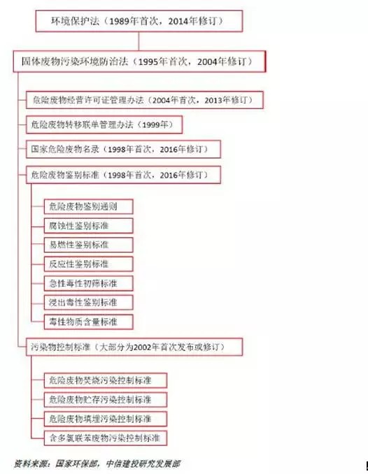 自2012年《“十二五”危險(xiǎn)廢物污染防治規(guī)劃》發(fā)布后,國(guó)家將危廢污染防治工作作為環(huán)境保護(hù)的重點(diǎn)領(lǐng)域。有關(guān)危險(xiǎn)廢物管理的法律法規(guī)和技術(shù)規(guī)范也在近幾年間陸續(xù)發(fā)布,加速推進(jìn)了危廢產(chǎn)業(yè)的發(fā)展。以2004年修訂的《固體廢物污染環(huán)境防治法》為龍頭,以2007年修訂的《危險(xiǎn)廢物經(jīng)營(yíng)許可證管理辦法》和的1999年的《醫(yī)療廢物管理?xiàng)l例》為骨干,以2008年第二次修訂《國(guó)家危險(xiǎn)廢物名錄》、2016年第三次修訂《國(guó)家危險(xiǎn)廢物名錄》、2013年的《危險(xiǎn)廢物轉(zhuǎn)移聯(lián)單管理辦法》和危險(xiǎn)廢物鑒別、焚燒、填埋標(biāo)準(zhǔn)為枝干,我國(guó)已構(gòu)建了一系列危廢處理過(guò)程管理制度,進(jìn)一步增加危險(xiǎn)廢物處理量、減少非法處置、推動(dòng)技術(shù)提升及提高危險(xiǎn)廢物處理服務(wù)的需求。