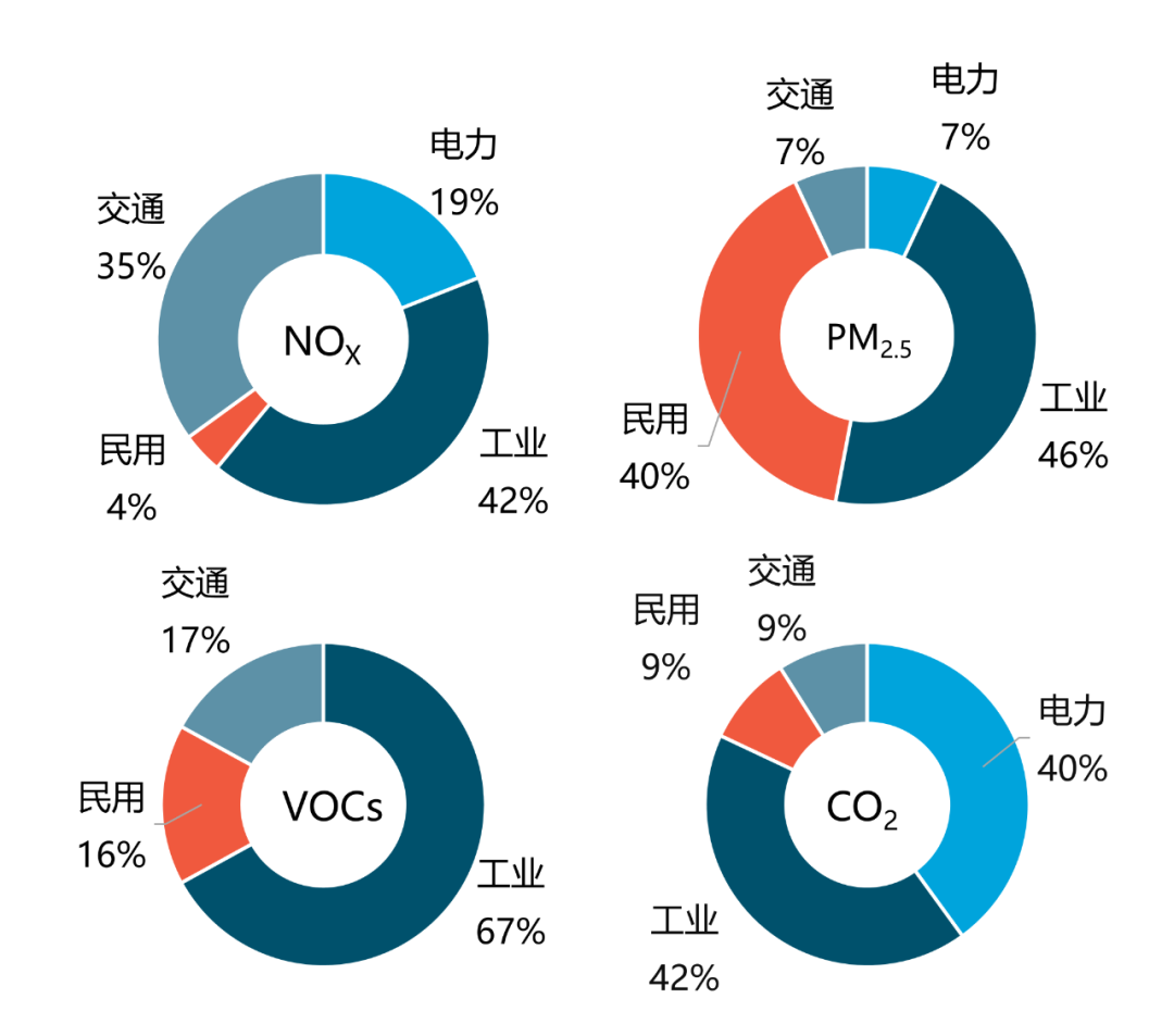 數(shù)據(jù)來(lái)源:污染物清單來(lái)自清華大學(xué) MEIC 清單結(jié)果 [6],CO2 排放數(shù)據(jù)來(lái)自生態(tài)環(huán)境部環(huán)境規(guī)劃院碳情速報(bào)研究結(jié)果 [19]