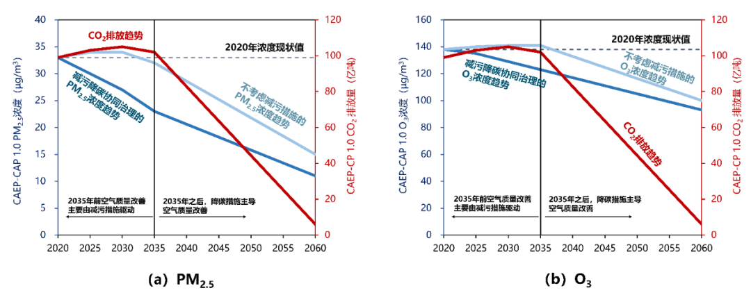 注:PM2.5 濃度為年均值,O3 濃度為 O3 日最大 8 小時(shí)全年濃度第 90 百分位數(shù)全國(guó)均值;數(shù)據(jù)來(lái)源于生態(tài)環(huán)境部環(huán)境規(guī)劃院研究成果 [12]