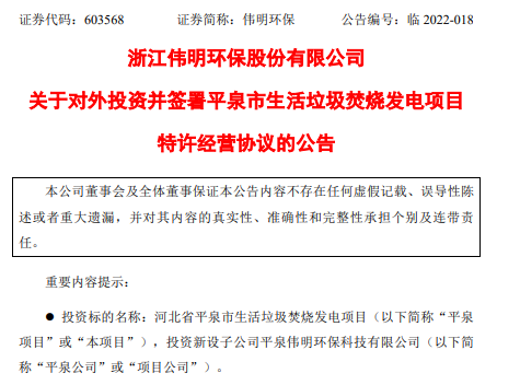 據(jù)悉,偉明環(huán)保作為聯(lián)合體牽頭人與上海寶達(dá)環(huán)境科技有限公司組成的聯(lián)合體于2022年1月被確認(rèn)為該項(xiàng)目的中標(biāo)社會(huì)資本。偉明環(huán)保負(fù)責(zé)投資、建設(shè)和運(yùn)營(yíng)平泉市生活垃圾焚燒發(fā)電特許經(jīng)營(yíng)項(xiàng)目,公司以自有資金不超過(guò) 9,000 萬(wàn)元投資于本項(xiàng)目。