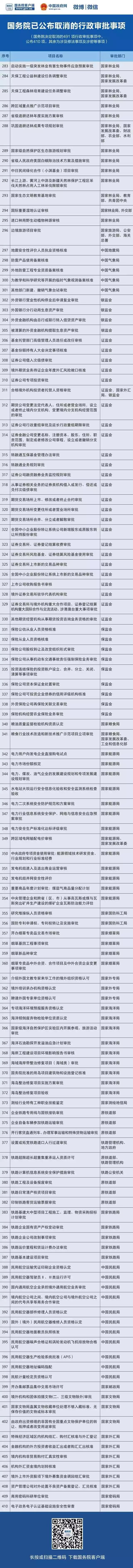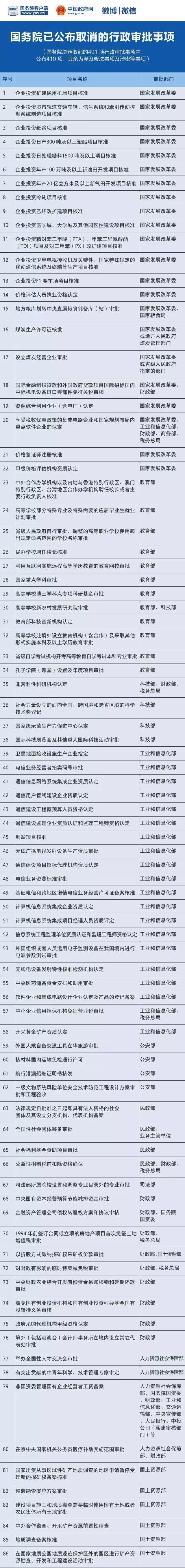 (注:國務(wù)院決定取消的491項(xiàng)行政審批事項(xiàng)中,公布410項(xiàng),其余為涉及修法事項(xiàng)及涉密等事項(xiàng)。)
