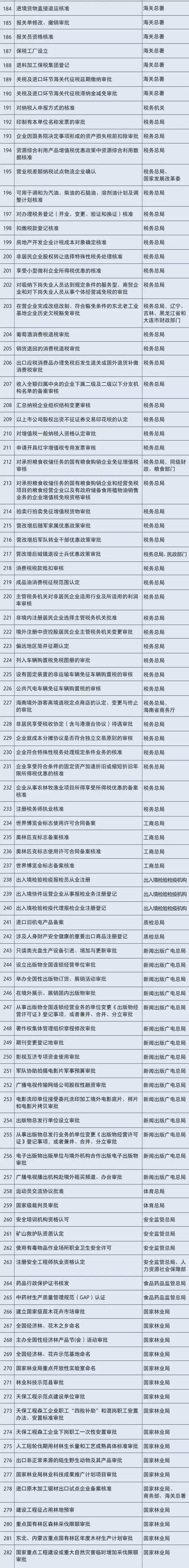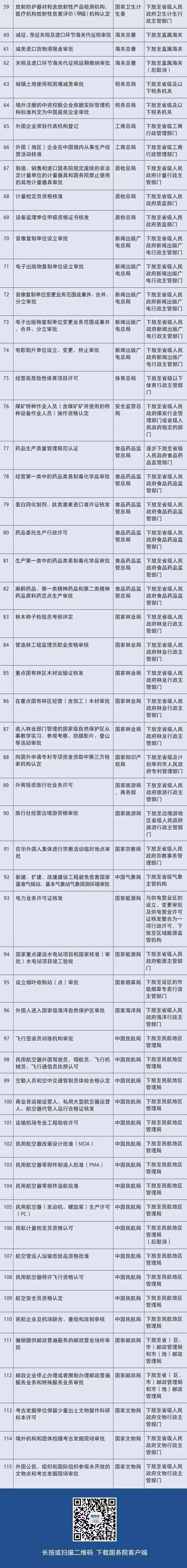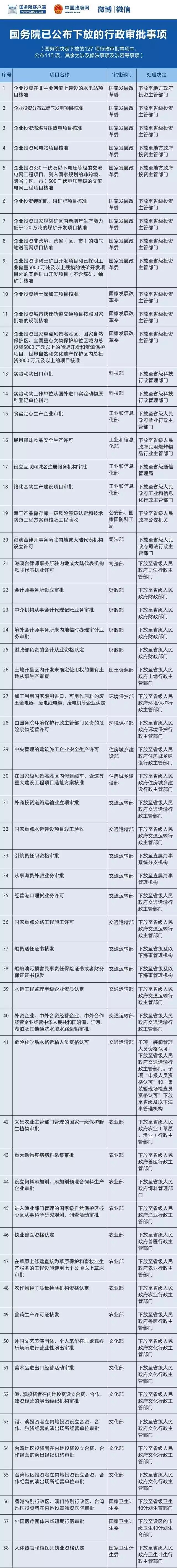 (注:國務(wù)院決定下放的127項(xiàng)行政審批事項(xiàng)中,公布115項(xiàng),其余為涉及修法事項(xiàng)及涉密等事項(xiàng)。)