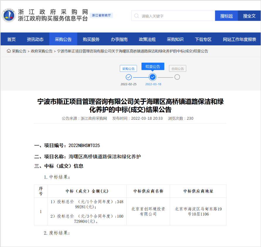 3月18日,浙江政府采購網(wǎng)發(fā)布寧波市海曙區(qū)高橋鎮(zhèn)道路保潔和綠化養(yǎng)護項目中標公告,北京首創(chuàng)環(huán)境投資有限公司以10072.9804萬元/3年的投標價格中標該項目。