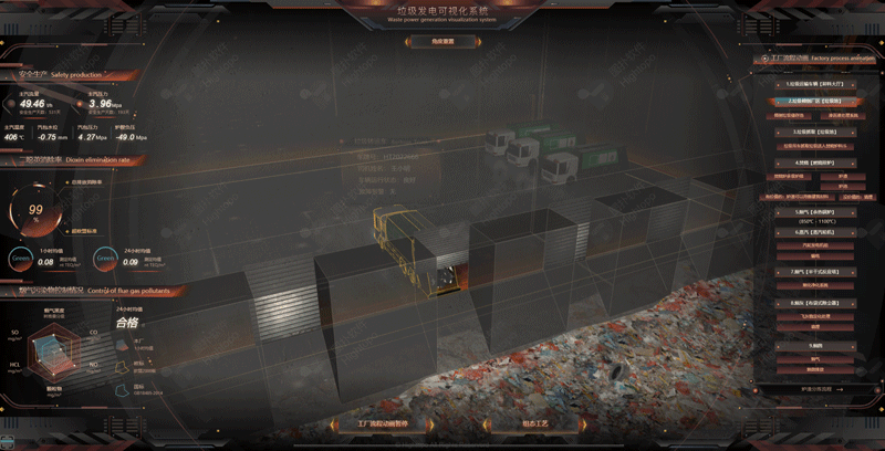 HT 左側(cè)面板循環(huán)播放煙氣污染物控制情況、二噁英消除率、以及安全生產(chǎn)關(guān)鍵指標(biāo)等。