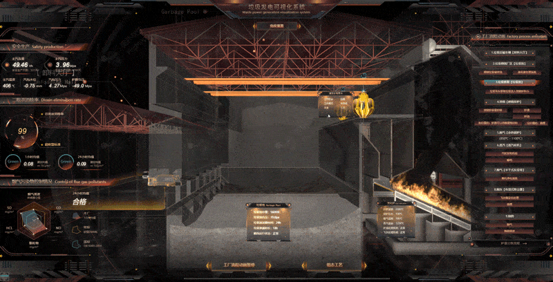 通過 GIS、垃圾池容量、投放量、垃圾池開放時間及不同的算法,獲得關(guān)于垃圾池(Garbage Pool)以及抓鉤準(zhǔn)確及時的信息,數(shù)字孿生垃圾接受及給料過程,2D 面板顯示存量、負(fù)壓、發(fā)酵時間、垃圾滲液時長、抓鉤運(yùn)行狀態(tài)、工作模式以及承重。幫助管理人員解決給料過程中的一些問題,包括垃圾抓取、傾倒位置的設(shè)置是否合理,垃圾發(fā)電的設(shè)計與規(guī)劃是否可持續(xù)等。