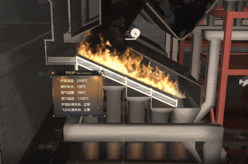 垃圾焚燒系統(tǒng)完全燃燒所產(chǎn)生的熱能經(jīng)余熱鍋爐轉(zhuǎn)化為蒸汽,再由蒸汽輪機(jī)發(fā)電機(jī)轉(zhuǎn)化為電能,從而完成一系列的能量轉(zhuǎn)換。系統(tǒng)結(jié)合 5G 通信系統(tǒng),全方面支持對鍋爐燃燒數(shù)據(jù)可視分析。通過 3D 模型形象呈現(xiàn)發(fā)電機(jī)外部結(jié)構(gòu)和工作狀態(tài);蒸汽流量、電機(jī)轉(zhuǎn)數(shù)、發(fā)電量、電機(jī)溫度等顯示在 2D 面板,自動播放。