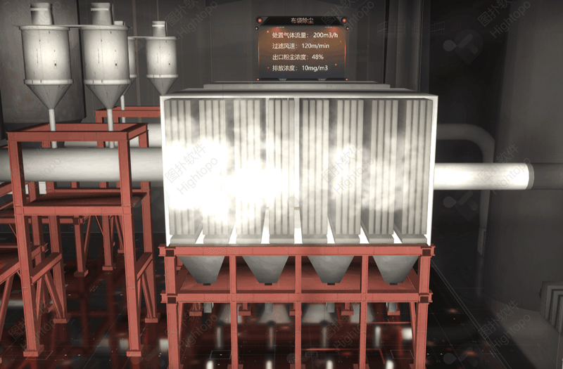 煙氣凈化系統(tǒng)是組合了半干式反應(yīng)塔、活性炭定量裝置、布袋式除塵器這三個步驟的系統(tǒng)。HT 通過對垃圾在焚燒所產(chǎn)生的煙氣、煙氣處理系統(tǒng)、凈化后通過煙囪排入大氣等過程對煙氣進(jìn)行虛擬仿真,在場景內(nèi)模擬煙氣凈化過程。煙氣經(jīng)過余熱鍋爐放出熱量后進(jìn)入噴霧吸收反應(yīng)塔。