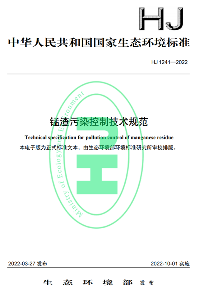 標準名稱、編號如下:《錳渣污染控制技術規(guī)范》(HJ 1241-2022)