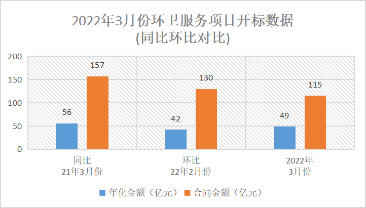 受疫情影響,三月份全國范圍環(huán)衛(wèi)服務項目大面積暫停招標或推遲開標,與去年同期(同比)及今年二月份(環(huán)比)相比,環(huán)衛(wèi)服務項目成交年化額及合同額均出現(xiàn)不同程度下降。