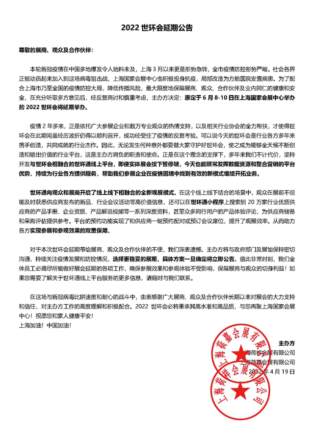 本輪新冠疫情在中國多地爆發(fā)令人始料未及,上海3月以來更是形勢急轉(zhuǎn),全市疫情防控形勢嚴(yán)峻。社會各界正被動員起來加入到這場病毒狙擊戰(zhàn),上海國家會展中心也積極投身抗疫,局部改造為方艙醫(yī)院安置病患。為了配合上海市乃至全國的疫情防控大局,降低傳播風(fēng)險,最大限度地保障展商、觀眾、合作伙伴及業(yè)內(nèi)同仁的健康和安全,在充分聽取多方意見后,經(jīng)反復(fù)商討和慎重考慮,主辦方?jīng)Q定:原定于6月8-10日在上海國家會展中心舉辦的2022世環(huán)會將延期舉辦。