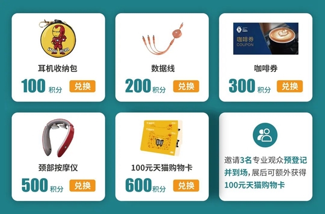 注:積分可在展會現(xiàn)場兌換天貓購物卡、頸部按摩儀、咖啡券、收納包等精美禮品
