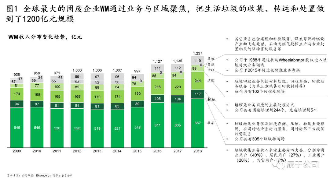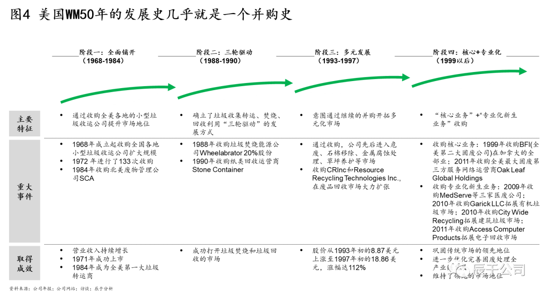美國WM的50年發(fā)展幾乎就是一個(gè)并購史,可分為四個(gè)階段(見圖4):1968~1984年全面鋪開階段,通過收購全美各地的小型垃圾收運(yùn)公司提升市場地位,其中1972 年就進(jìn)行了133 次收購,1984年收購北美廢物管理公司SCA之后,成為全美第一大垃圾運(yùn)轉(zhuǎn)商;1988~1990年三輪驅(qū)動(dòng)階段,確立了垃圾收集轉(zhuǎn)運(yùn)、焚燒、回收利用“三輪驅(qū)動(dòng)”的發(fā)展方式,通過并購垃圾焚燒能源公司W(wǎng)heelabrator和紙類回收運(yùn)營商Stone Container等手段實(shí)現(xiàn);1993~1997年多元發(fā)展階段,WM意圖通過大舉并購開拓多元化市場,通過收購先后進(jìn)入危廢、石棉移除、金屬腐蝕處理、草坪養(yǎng)護(hù)等市場,股價(jià)從1993年初的8.87美元上漲至1997年初的18.86 美元,漲幅達(dá)112%(不過事后證明這個(gè)階段的過度多元化并購是失敗的);1999年以后WM開始專注在核心業(yè)務(wù)+專業(yè)化新生業(yè)務(wù)的并購,其中核心業(yè)務(wù)收購了BFI(全美第二大固廢公司)在加拿大的全部業(yè)務(wù)和全美最大固廢第三方服務(wù)網(wǎng)絡(luò)運(yùn)營商Oak Leaf Global Holdings,這些并購不僅鞏固了WM傳統(tǒng)市場的領(lǐng)先地 U7Y位,也完善了固廢處理全產(chǎn)業(yè)鏈布局。