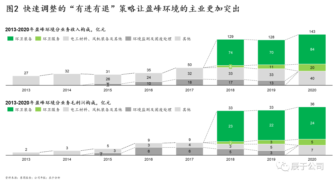 盈峰環(huán)境2015年進(jìn)入環(huán)保產(chǎn)業(yè),經(jīng)歷過一系列小型并購但毫無起色的彎路之后,2018年開始聚焦環(huán)衛(wèi)行業(yè),當(dāng)年以152.5億元全資收購中聯(lián)環(huán)境,正式進(jìn)入環(huán)衛(wèi)裝備及環(huán)衛(wèi)運(yùn)營一體化服務(wù)領(lǐng)域。收購?fù)瓿珊螅h(huán)衛(wèi)裝備及環(huán)衛(wèi)服務(wù)業(yè)務(wù)的占比超過80%,成為公司的核心主業(yè),到2020年收入規(guī)模就達(dá)到了143億,幾乎是2017年49億的3倍(見圖2)。