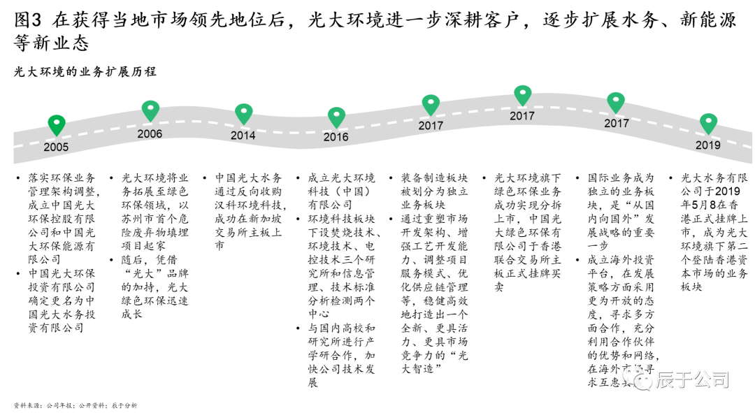 光大環(huán)境在獲得當(dāng)?shù)乩贌袌龅念I(lǐng)先地位后,進(jìn)一步深耕客戶,逐步擴(kuò)展水務(wù)、新能源等業(yè)態(tài)(見圖3),最終目標(biāo)是打造成為一站式環(huán)境綜合治理服務(wù)商,形成環(huán)保能源、綠色環(huán)保、環(huán)保水務(wù)、生態(tài)資源、環(huán)境規(guī)劃、綠色科創(chuàng)、光大照明、裝備制造八大業(yè)務(wù)板塊,深挖協(xié)同效應(yīng)。
