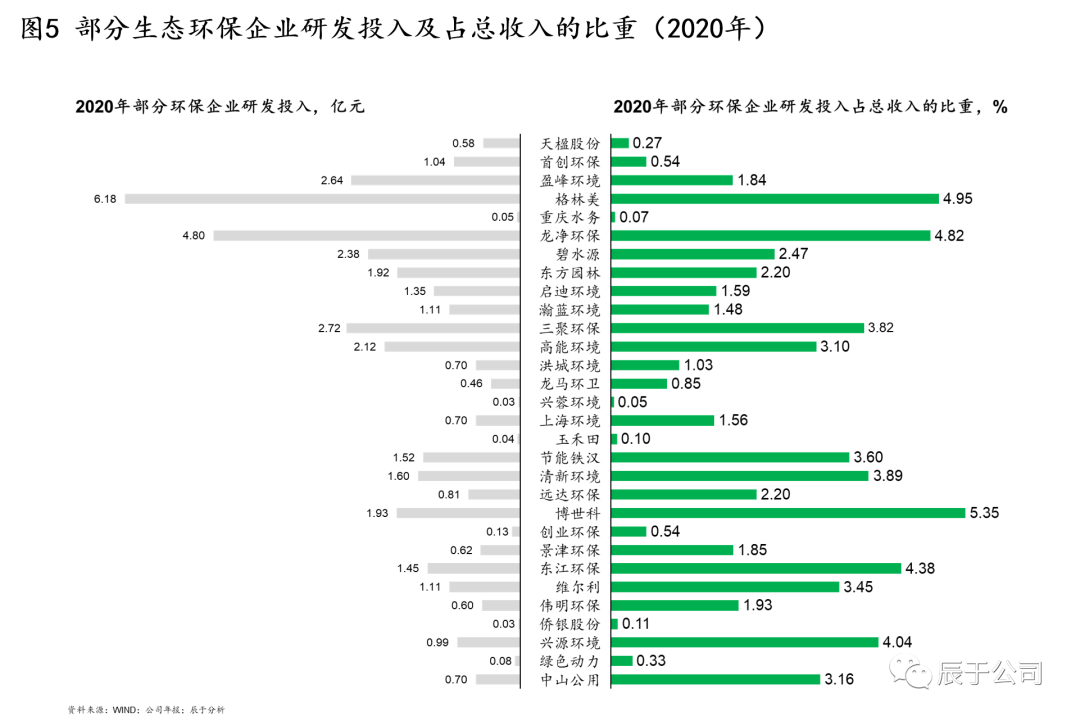 不得不說,大部分生態(tài)環(huán)保企業(yè)并不重視技術(shù)創(chuàng)新投入。對(duì)國內(nèi)環(huán)保上市企業(yè)的統(tǒng)計(jì)發(fā)現(xiàn),很多企業(yè)每年的研發(fā)投入不足2億元,占收入的比重不足3%(見圖5)。即使全球巨頭蘇伊士環(huán)境,每年研發(fā)投入近1億歐元,占其收入的比重不足1%。