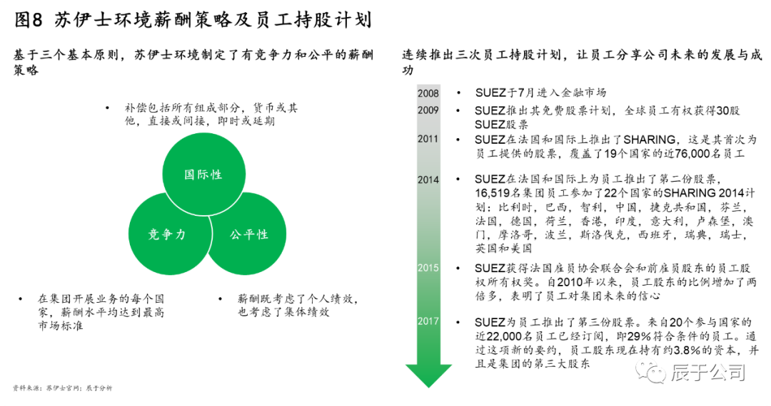 在員工保留方面,蘇伊士通過實(shí)施長短結(jié)合的薪酬政策吸引和激勵(lì)員工,并持續(xù)推出員工持股計(jì)劃讓員工分享公司的發(fā)展與成功。一方面,蘇伊士基于國際性、競爭性和公平性三個(gè)原則制定薪酬策略,確保薪酬政策符合當(dāng)?shù)厥袌鲆螅瑫r(shí)也確保薪酬水平在當(dāng)?shù)靥幱谳^高水平;另一方面,蘇伊士自2009年開始連續(xù)推出三次員工持股計(jì)劃,截至2017年底,員工股東持有約3.8%的股權(quán),并且是集團(tuán)的第三大股東(如圖8)。