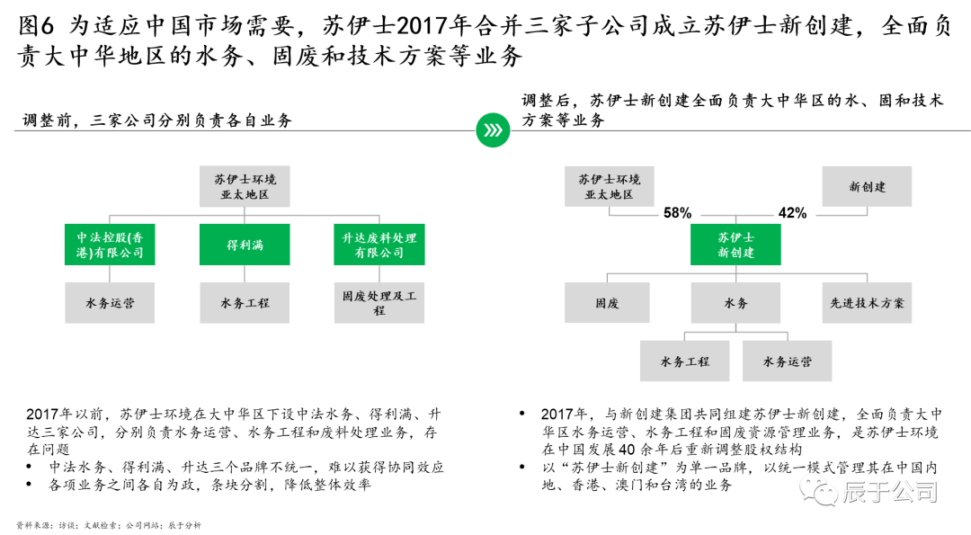 蘇伊士中國也在2017年對(duì)其組織架構(gòu)進(jìn)行了優(yōu)化。2017年以前,蘇伊士在大中華區(qū)下設(shè)中法水務(wù)、得利滿、升達(dá)三家公司,分別負(fù)責(zé)水務(wù)運(yùn)營、水務(wù)工程和固廢廢物處理業(yè)務(wù),由于三個(gè)品牌不統(tǒng)一、難以獲得協(xié)同效應(yīng),各業(yè)務(wù)之間各自為政、條塊分割,降低了整體效率。對(duì)此,2017年蘇伊士與新創(chuàng)建集團(tuán)共同組建蘇伊士新創(chuàng)建,全面負(fù)責(zé)公司在大中華地區(qū)的水務(wù)運(yùn)營、水務(wù)工程和固廢資源管理業(yè)務(wù),這是蘇伊士在中國發(fā)展 40 余年后重新調(diào)整股權(quán)結(jié)構(gòu),同時(shí)以“蘇伊士新創(chuàng)建”為單一品牌,以統(tǒng)一模式管理其在中國內(nèi)地、香港、澳門和臺(tái)灣的業(yè)務(wù)(見圖6)。2021年初對(duì)蘇伊士新創(chuàng)建和蘇渝兩家公司的股權(quán)收購則進(jìn)一步強(qiáng)化了組織合力。