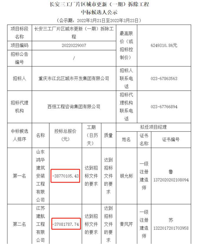 這個(gè)奇葩的案例,就是不久前發(fā)布中標(biāo)公告的重慶市長(zhǎng)安三工廠片區(qū)城市更新(一期)拆除工程項(xiàng)目。中標(biāo)人為山東鴻華建筑安裝工程有限公司(私企),中標(biāo)金額約為“-3877.01萬元”。更有意思的是,第二中標(biāo)人和第三中標(biāo)人的報(bào)價(jià)分別為-3708.18萬元和-3517.51萬元,也均為負(fù)數(shù)。