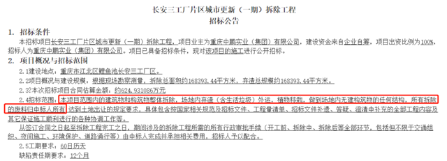2022年2月23日,重慶中鵬實(shí)業(yè)(集團(tuán))有限公司發(fā)布了長(zhǎng)安三工廠片區(qū)城市更新(一期)拆除工程的招標(biāo)公告。招標(biāo)公告稱,拆除總面積約168393.44平方米,棄渣總規(guī)模約168393.44平方米,合同金額約為約624.931086萬元。