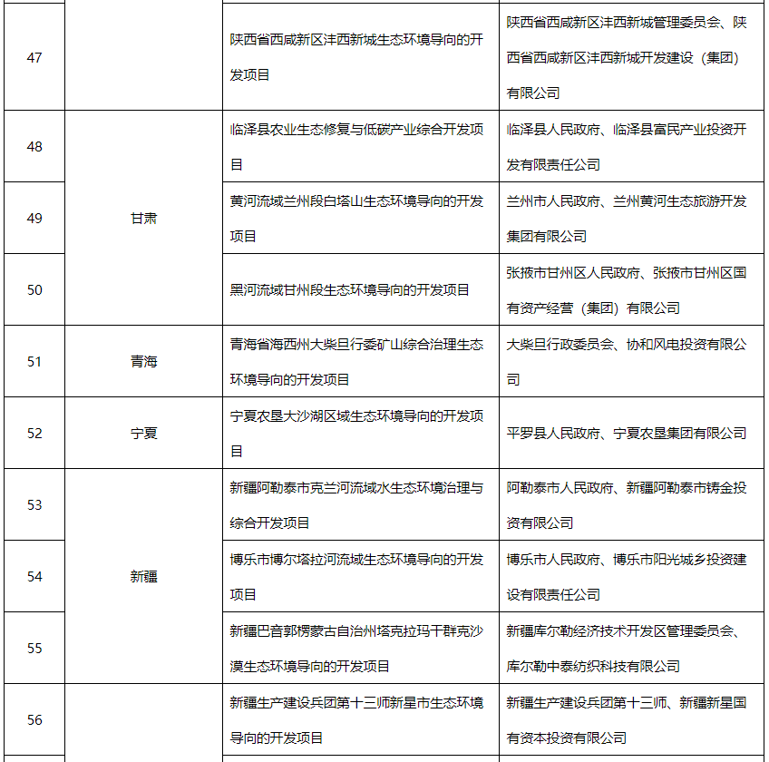 同時(shí),對(duì)于第二批試點(diǎn),3部門還提出了4點(diǎn)要求。?1、認(rèn)真貫徹國(guó)家有關(guān)生態(tài)環(huán)境治理模式創(chuàng)新和環(huán)保產(chǎn)業(yè)發(fā)展要求在試點(diǎn)工作開展過程中積極探索,創(chuàng)新生態(tài)環(huán)境治理項(xiàng)目組織實(shí)施方式,促進(jìn)生態(tài)環(huán)境高水平保護(hù)和區(qū)域經(jīng)濟(jì)高質(zhì)量發(fā)展。省級(jí)生態(tài)環(huán)境、發(fā)展改革部門等試點(diǎn)推進(jìn)單位加強(qiáng)對(duì)試點(diǎn)工作的督促指導(dǎo),對(duì)試點(diǎn)工作中發(fā)現(xiàn)的問題要及時(shí)予以糾正,推進(jìn)試點(diǎn)工作規(guī)范實(shí)施。國(guó)家開發(fā)銀行有關(guān)分行對(duì)符合條件的試點(diǎn)項(xiàng)目,按照精準(zhǔn)施策、市場(chǎng)化運(yùn)作和風(fēng)險(xiǎn)可控原則,發(fā)揮開發(fā)性金融大額中長(zhǎng)期資金優(yōu)勢(shì),統(tǒng)籌考慮經(jīng)濟(jì)效益和環(huán)境效益,在資源配置上予以傾斜,加大支持力度。也就是說,省級(jí)環(huán)保部門和發(fā)改部門要加強(qiáng)指導(dǎo)監(jiān)督,而國(guó)開行有關(guān)分行則要在資源分配上予以傾斜,加大支持。試點(diǎn)實(shí)施單位是試點(diǎn)工作的責(zé)任主體,要嚴(yán)格履行試點(diǎn)實(shí)施承諾,不以試點(diǎn)名義突破現(xiàn)有法律法規(guī)政策等要求,嚴(yán)格落實(shí)招投標(biāo)、政府采購(gòu)、投融資、土地、資源開發(fā)、空間管控、資產(chǎn)處置等各項(xiàng)法規(guī)政策,不以任何形式增加地方政府隱性債務(wù)。采用合法合規(guī)方式選擇具備較強(qiáng)產(chǎn)業(yè)投資運(yùn)營(yíng)能力的項(xiàng)目實(shí)施主體,由一個(gè)主體一體化實(shí)施,確保產(chǎn)業(yè)開發(fā)項(xiàng)目持續(xù)運(yùn)營(yíng)。這一條,是有關(guān)風(fēng)險(xiǎn)防范的條款,告知試點(diǎn)實(shí)施單位要注意控制政府隱性債務(wù),依法開展試點(diǎn)。?3、強(qiáng)化項(xiàng)目收益內(nèi)部反哺機(jī)制試點(diǎn)實(shí)施單位切實(shí)加強(qiáng)公益性生態(tài)環(huán)境治理項(xiàng)目與相關(guān)經(jīng)營(yíng)性產(chǎn)業(yè)開發(fā)項(xiàng)目一體化融合實(shí)施。在項(xiàng)目邊界范圍內(nèi)實(shí)現(xiàn)產(chǎn)業(yè)開發(fā)項(xiàng)目對(duì)生態(tài)環(huán)境治理項(xiàng)目建設(shè)與運(yùn)營(yíng)的持續(xù)性收益反哺。實(shí)施中可適當(dāng)優(yōu)化試點(diǎn)依托項(xiàng)目,加強(qiáng)產(chǎn)業(yè)收益對(duì)生態(tài)環(huán)境治理的反哺力度,減少政府資金投入,力爭(zhēng)實(shí)現(xiàn)政府資金“零投入”。大家知道,EOD項(xiàng)目都是“肥瘦搭配”,這一條就是要求“肥”項(xiàng)目要加強(qiáng)反哺“瘦”項(xiàng)目,從而減少政府資金投入,最好是實(shí)現(xiàn)政府資金“零投入”,應(yīng)該說這才是EOD模式的“初心”。試點(diǎn)實(shí)施單位加強(qiáng)統(tǒng)籌,及時(shí)總結(jié)經(jīng)驗(yàn)做法,探索形成可復(fù)制、可推廣的生態(tài)環(huán)境治理創(chuàng)新模式。按照《關(guān)于開展生態(tài)環(huán)境導(dǎo)向的開發(fā)模式試點(diǎn)定期調(diào)度的通知》要求,試點(diǎn)實(shí)施單位于每季度首月10日前將試點(diǎn)項(xiàng)目季度實(shí)施進(jìn)度情況表報(bào)送生態(tài)環(huán)境部科技與財(cái)務(wù)司。試點(diǎn)期內(nèi)每年12月底前將年度進(jìn)展情況報(bào)告報(bào)請(qǐng)省級(jí)生態(tài)環(huán)境、發(fā)展改革部門審查后,由兩部門上報(bào)生態(tài)環(huán)境部、國(guó)家發(fā)展改革委,抄報(bào)國(guó)家開發(fā)銀行。既然是試點(diǎn),最重要的任務(wù)肯定就是摸索經(jīng)驗(yàn)、探索模式,從而有利于以后的推廣,這一條就是關(guān)于這方面的規(guī)定。總的來看,第二批EOD模式試點(diǎn),國(guó)家的要求并不算很多,還是以探索為主,希望能夠形成可復(fù)制、可推廣的經(jīng)驗(yàn)。所以入選項(xiàng)目也可以盡可能地放開手腳,大膽試驗(yàn)。第一批試點(diǎn)授信額度達(dá)644億元