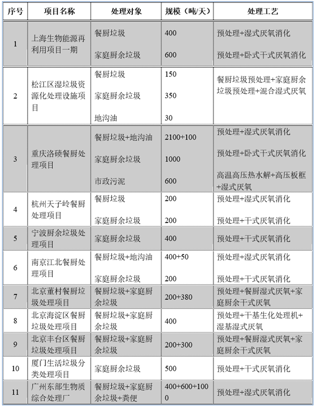 表2 國內(nèi)部分已建廚余垃圾處理設施和處理工藝統(tǒng)計表