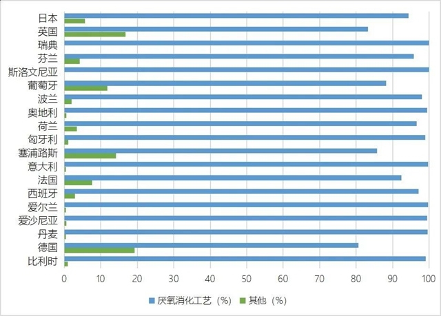 由圖1可以看出,目前發(fā)達國家的廚余垃圾處理技術主要以厭氧消化為主,約占市場份額的9成左右。其主要原因是相比于堆肥等其他處理技術,厭氧消化技術更加環(huán)保和先進,受到業(yè)內(nèi)的廣泛關注,逐步形成一套成熟的產(chǎn)業(yè)鏈,進而得到市場的認可和推廣。