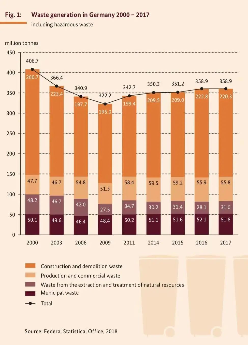 2016年德國共產生約1000萬噸廢木材——建筑和拆遷(404萬噸)、木工和木材加工(255萬噸)、大件垃圾(92萬噸)、包裝廢物(56萬噸)和 城市垃圾(52萬噸),凈進口141萬噸廢木材。經過機械加工,773萬噸被用于能源回收,58萬噸進行了熱處理;大約170萬噸被用于衍生木材產品行業(yè)的硬紙板制造(包括出口)。