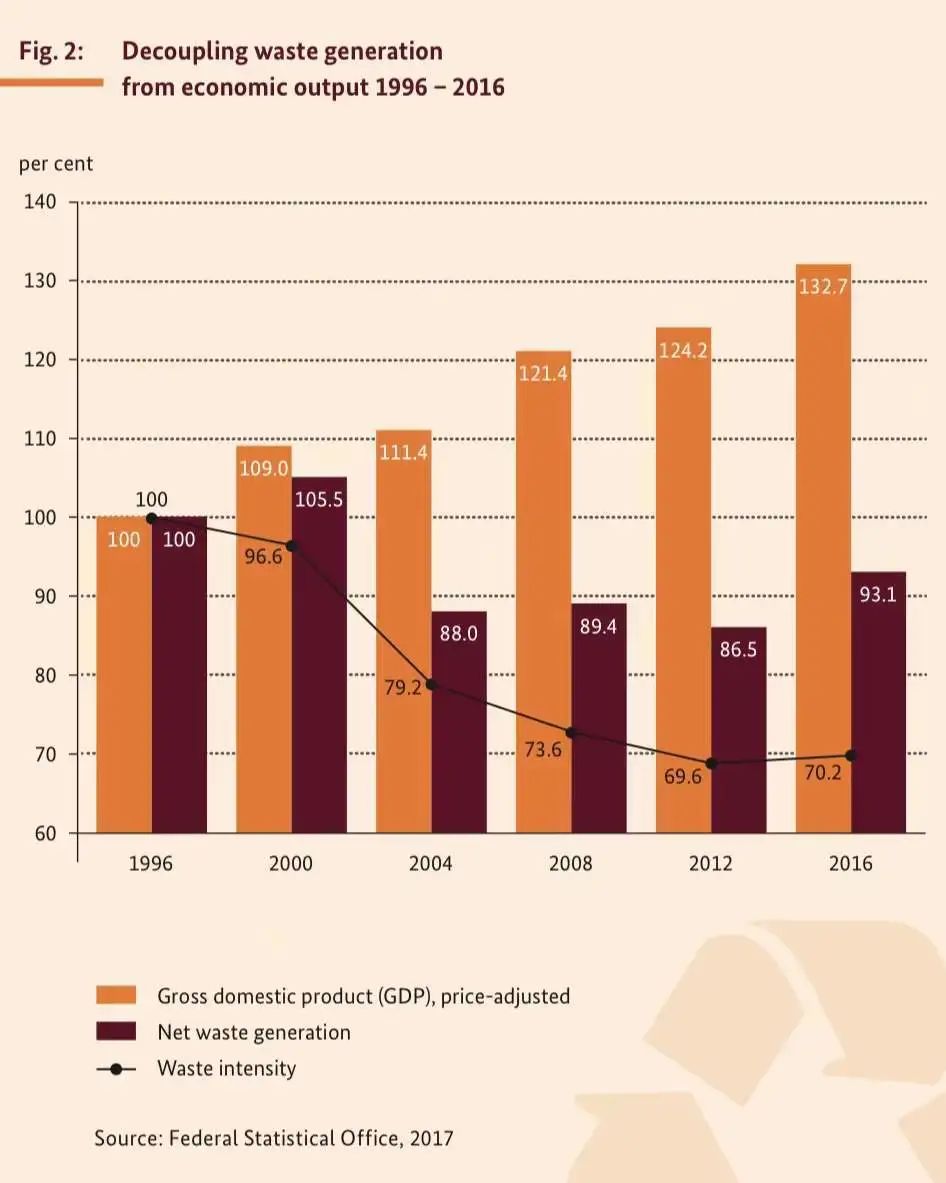 歐盟修訂的廢棄物法要求成員國在2025年達到55%的廢棄物回收率,2030年達到60%,2035年達到65%。同時,回收率的計算方法從基于投入改為面向產出。因此,德國廢棄物管理支持從源頭上對廢棄物進行分類。