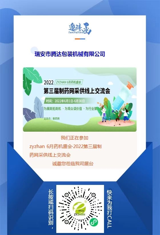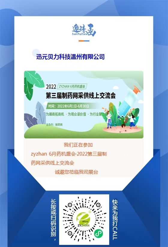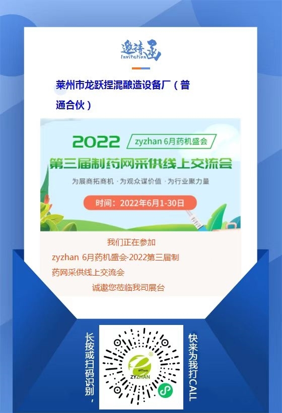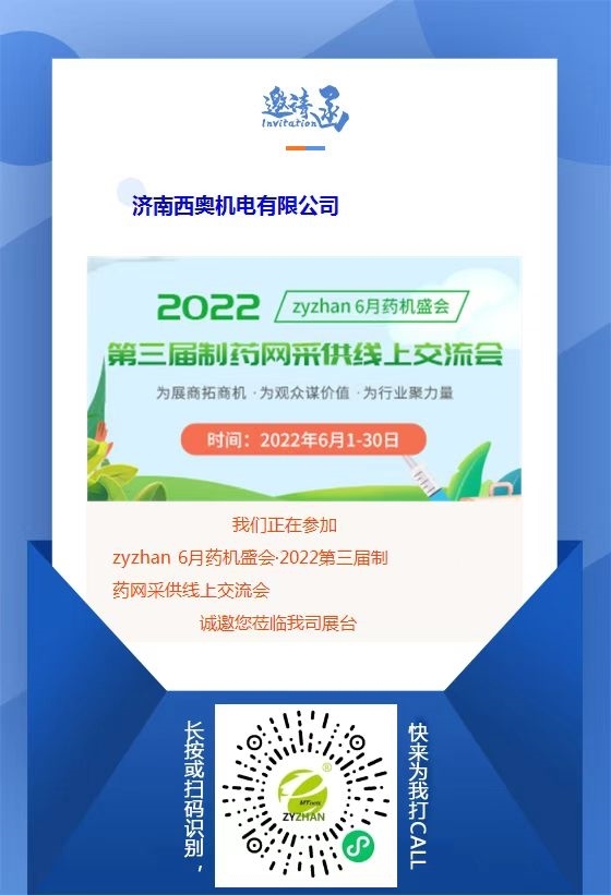 由制藥網(wǎng)主辦的zyzhan 6月藥機盛會——2022第三屆制藥網(wǎng)采供線上交流會(在線展會)(簡稱“zyzhan 6月藥機盛會”)即將于2022年6月1日-6月30日舉行。本次盛會設原料藥機械館、制劑機械館、儀器儀表館、藥品包裝機館、制藥用水/氣設備館、通用機械設備館、其他制藥設備館,目前超百家企業(yè)都已入駐相應展館,正在等待與您相見!